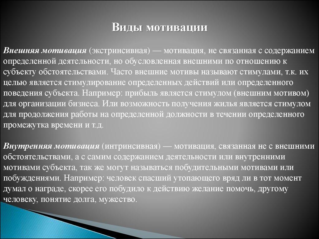 Виды мотивацииВнешняя мотивация (экстринсивная) — мотивация, не связанная с содержанием