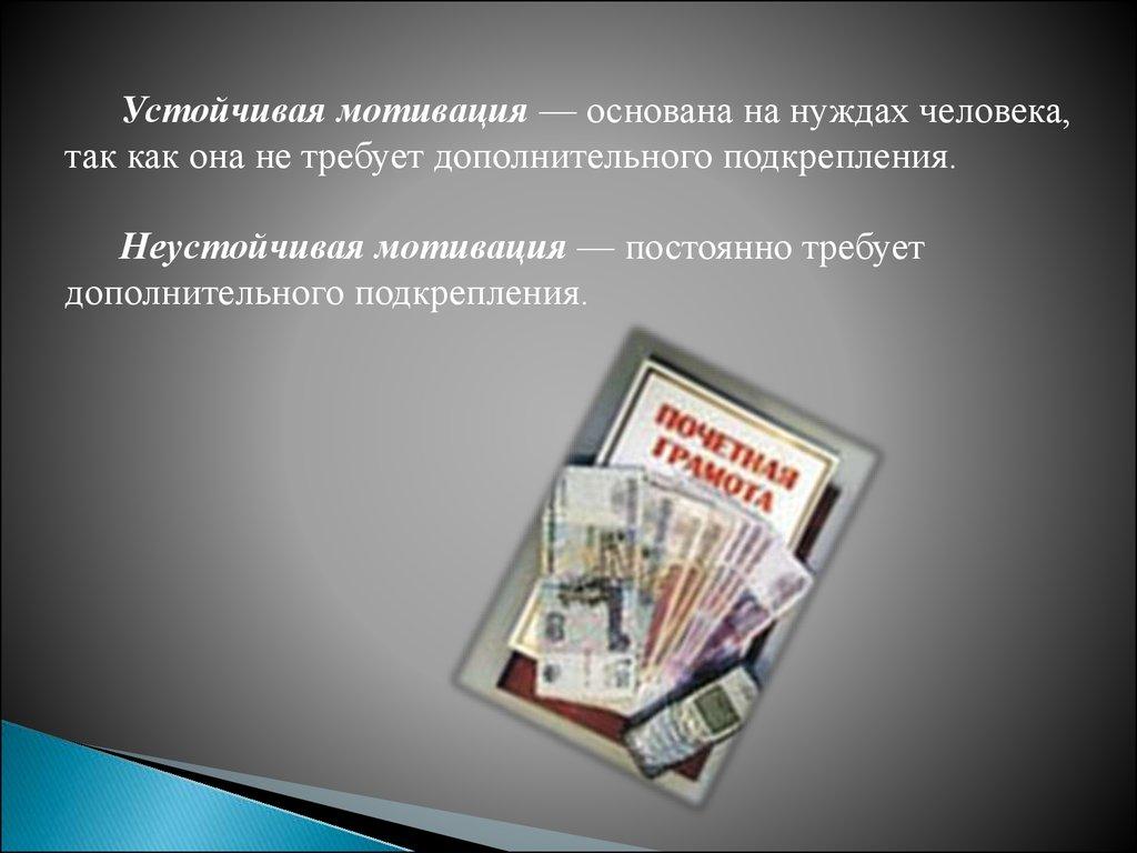 Устойчивая мотивация — основана на нуждах человека,так как она не требует дополнительного подкрепления.