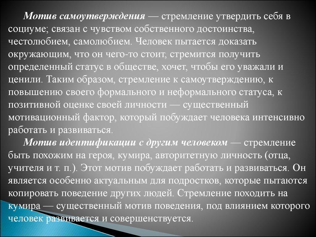 Мотив самоутверждения — стремление утвердить себя всоциуме; связан с чувством собственного достоинства,