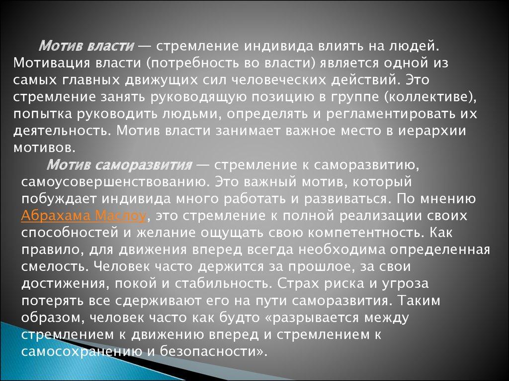 Мотив власти — стремление индивида влиять на людей.Мотивация власти (потребность во власти) является одной из