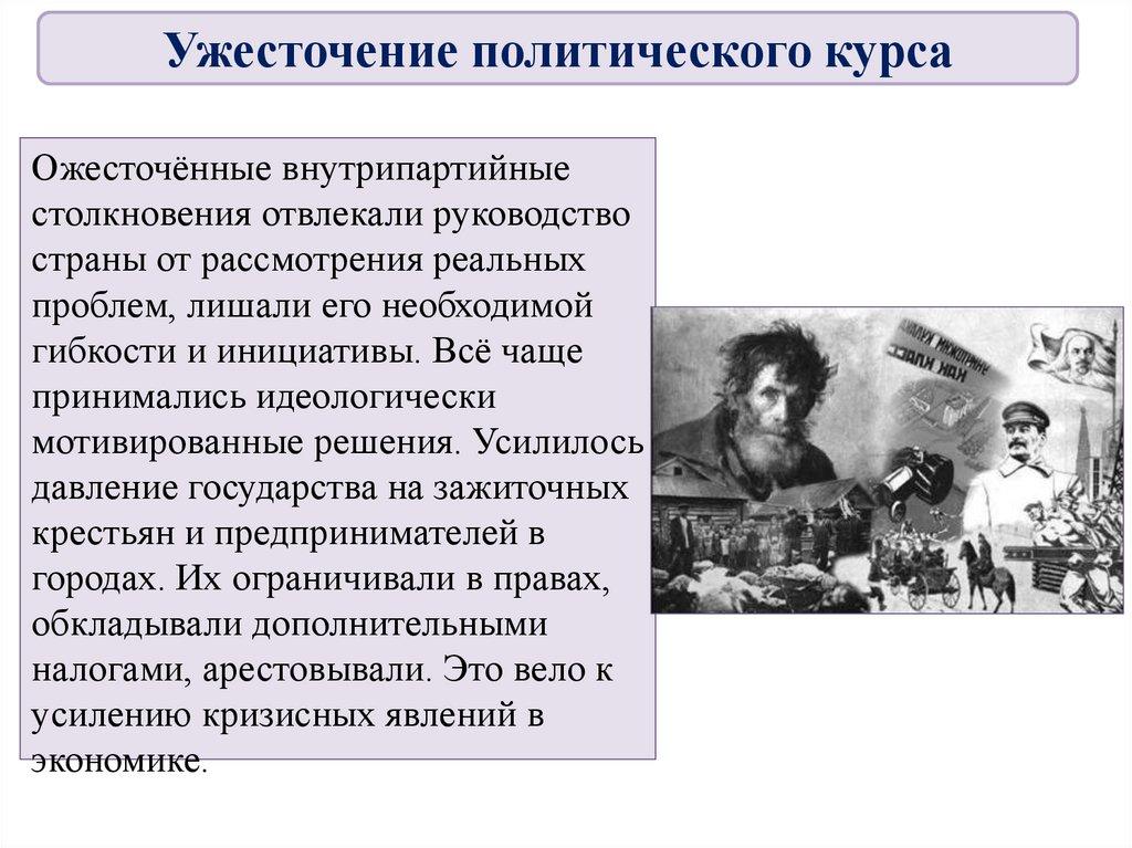Ужесточение политического курсаВнутрипартийная борьба оказала существенное воздействие на