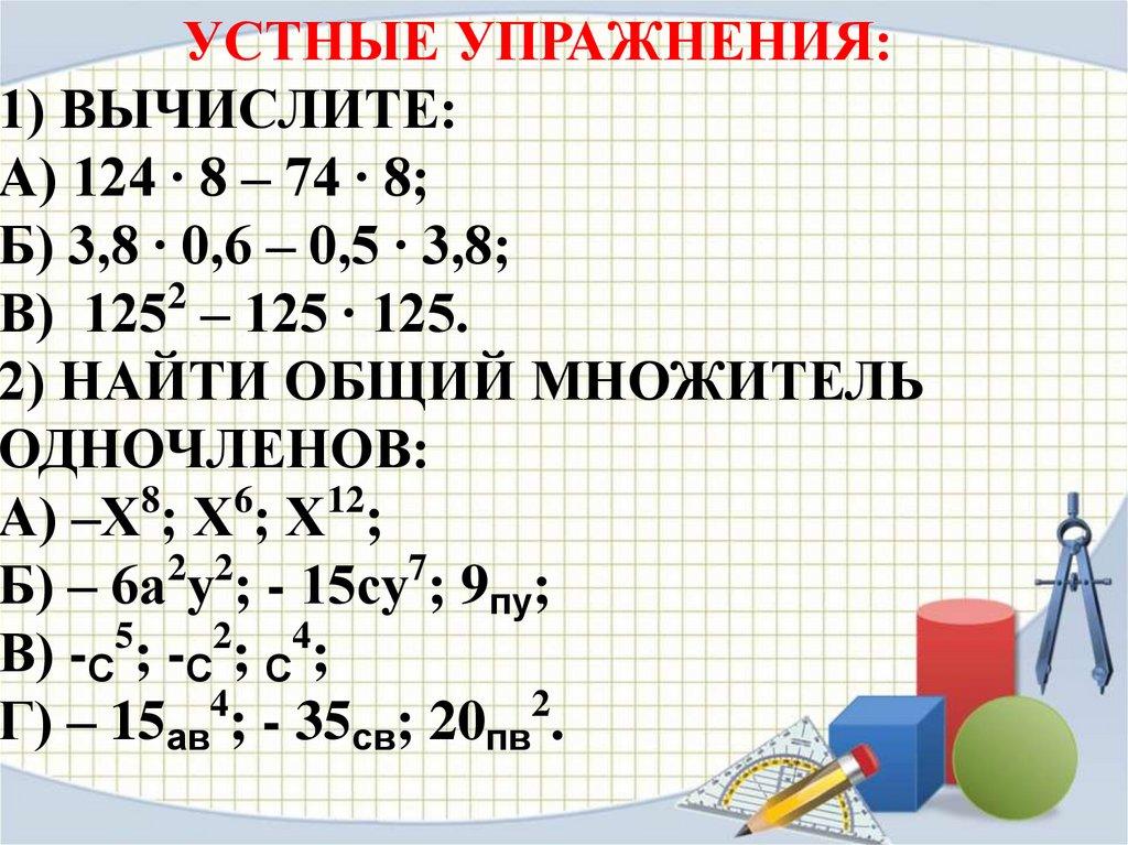 УСТНЫЕ УПРАЖНЕНИЯ:1) ВЫЧИСЛИТЕ: