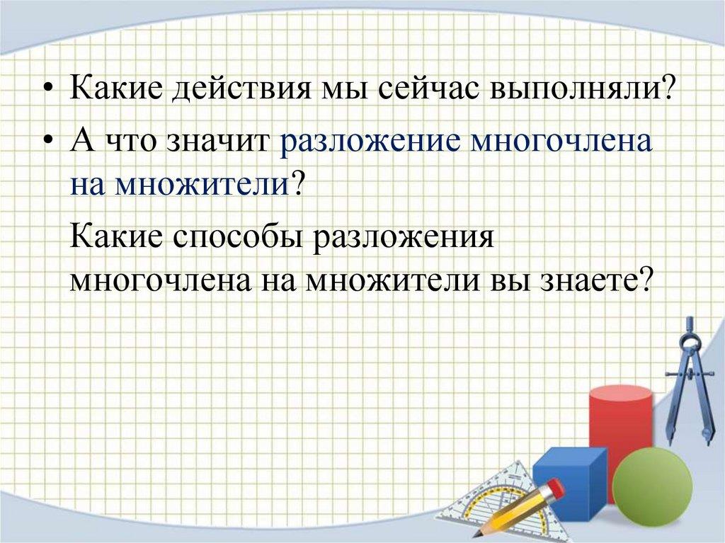 • Какие действия мы сейчас выполняли?• А что значит разложение многочлена