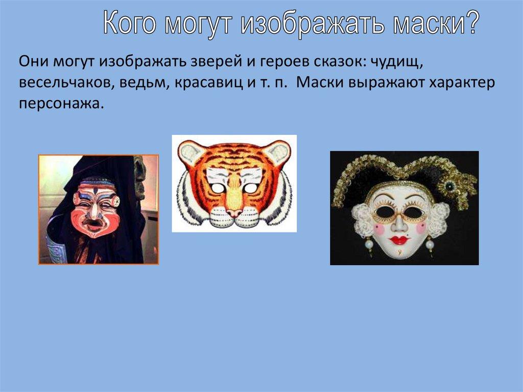 Они могут изображать зверей и героев сказок: чудищ,весельчаков, ведьм, красавиц и т. п. Маски выражают характер