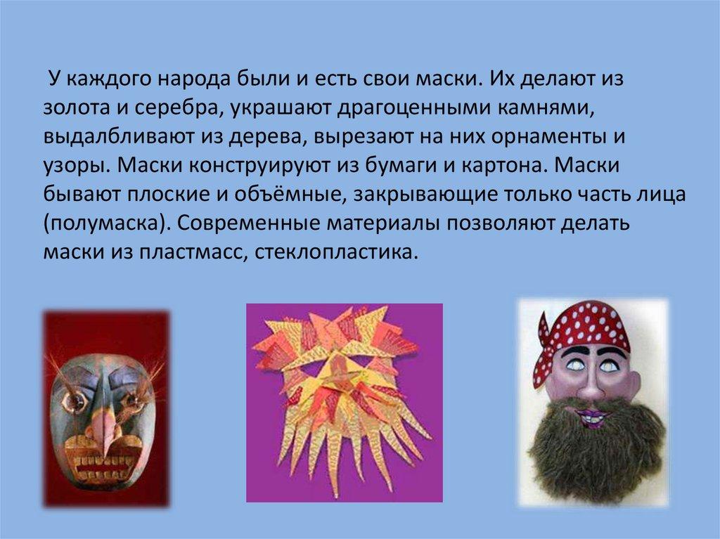 У каждого народа были и есть свои маски. Их делают иззолота и серебра, украшают драгоценными камнями,
