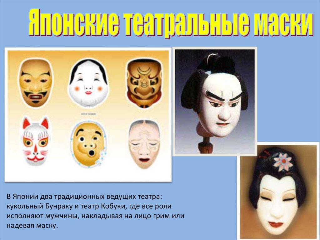 В Японии два традиционных ведущих театра:кукольный Бунраку и театр Кобуки, где все роли