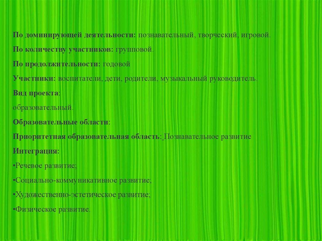 По доминирующей деятельности: познавательный, творческий, игровой.По количеству участников: групповой.
