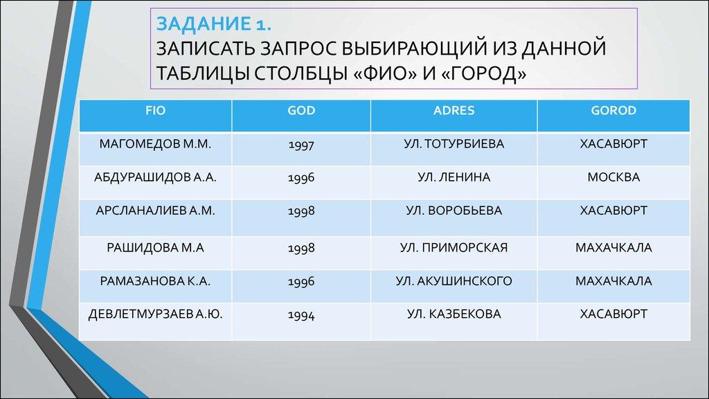ЗАДАНИЕ 1.ЗАПИСАТЬ ЗАПРОС ВЫБИРАЮЩИЙ ИЗ ДАННОЙ