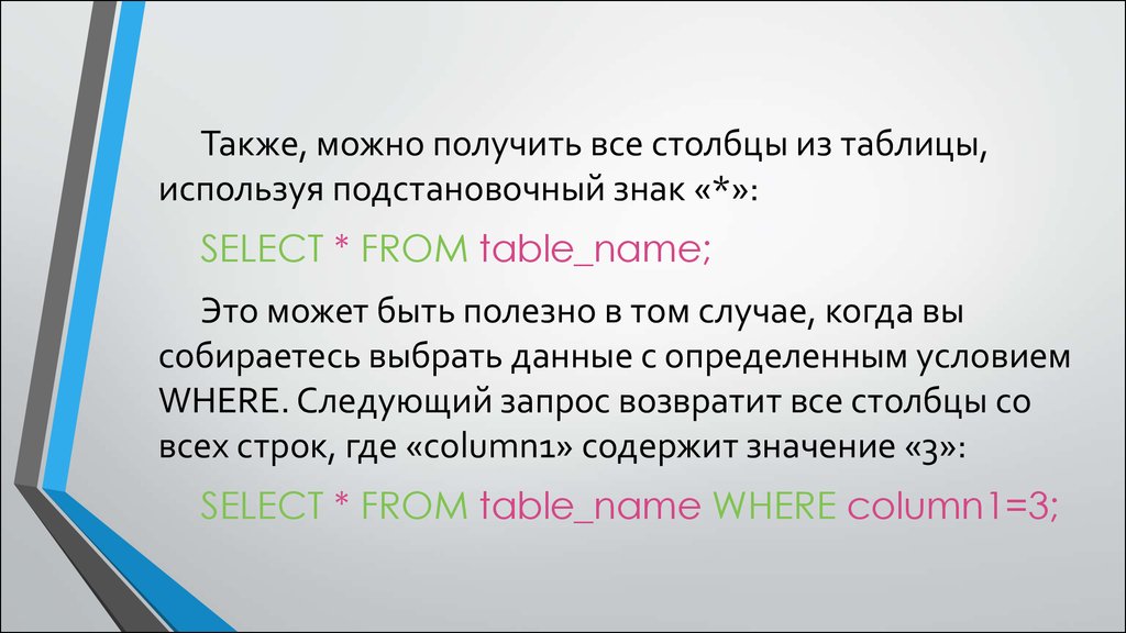 Также, можно получить все столбцы из таблицы,используя подстановочный знак «*»: