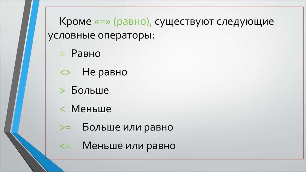 Кроме «=» (равно), существуют следующиеусловные операторы: