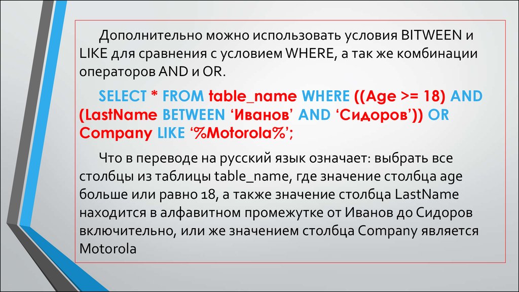 Дополнительно можно использовать условия BITWEEN иLIKE для сравнения с условием WHERE, а так же комбинации