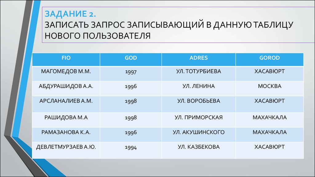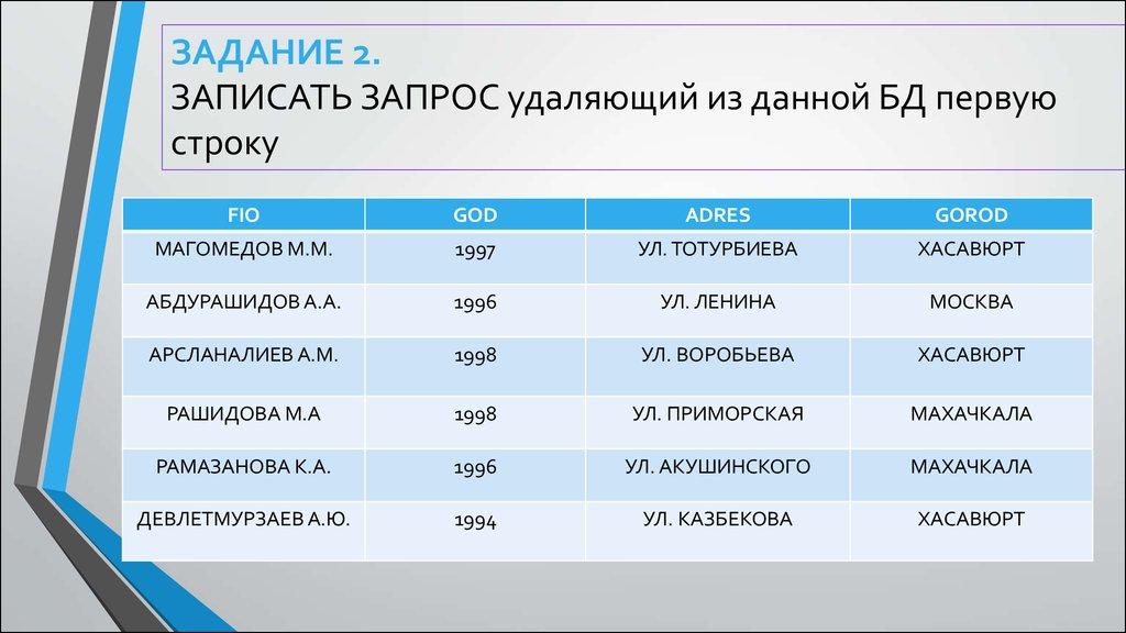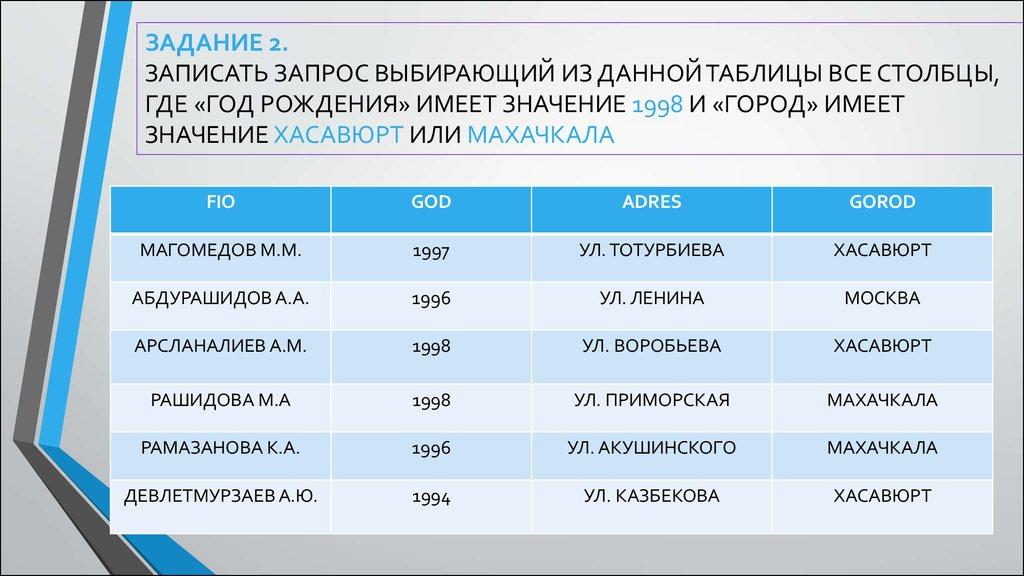 ЗАДАНИЕ 2.ЗАПИСАТЬ ЗАПРОС ВЫБИРАЮЩИЙ ИЗ ДАННОЙ ТАБЛИЦЫ ВСЕ