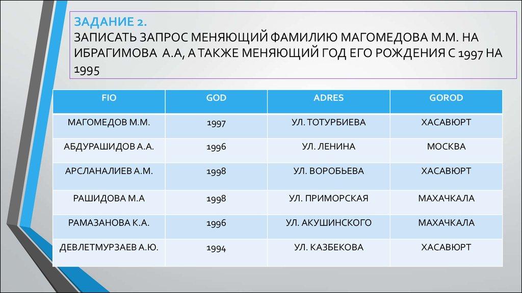 ЗАДАНИЕ 2.ЗАПИСАТЬ ЗАПРОС МЕНЯЮЩИЙ ФАМИЛИЮ МАГОМЕДОВА М.М. НА