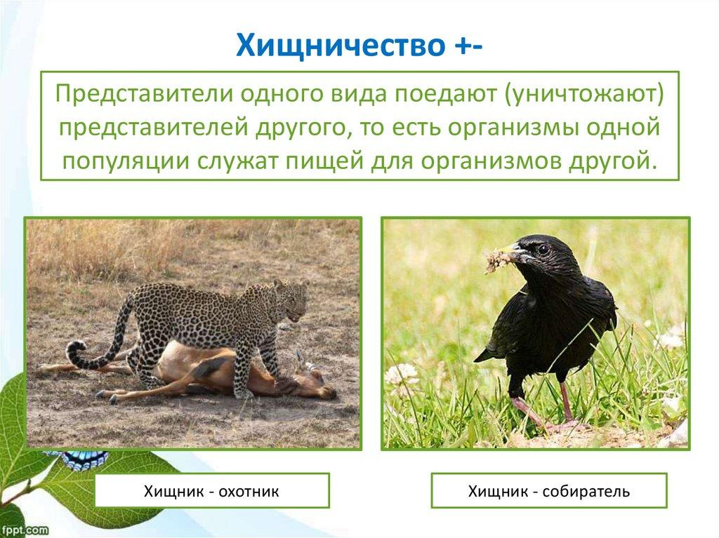 Хищничество +Представители одного вида поедают (уничтожают)представителей другого, то есть организмы одной