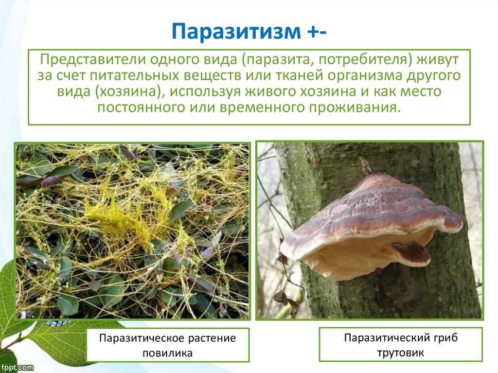Паразитизм +Представители одного вида (паразита, потребителя) живутза счет питательных веществ или тканей организма другого
