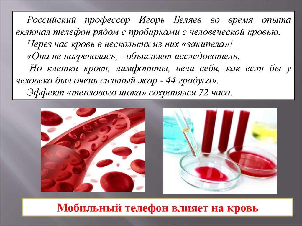 Российский профессор Игорь Беляев во время опытавключал телефон рядом с пробирками с человеческой кровью.