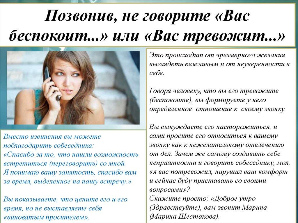 Позвонив, не говорите «Васбеспокоит...» или «Вас тревожит...»