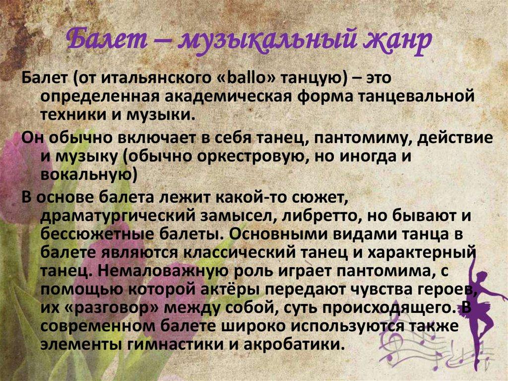 Балет – музыкальный жанрБалет (от итальянского «ballo» танцую) – это