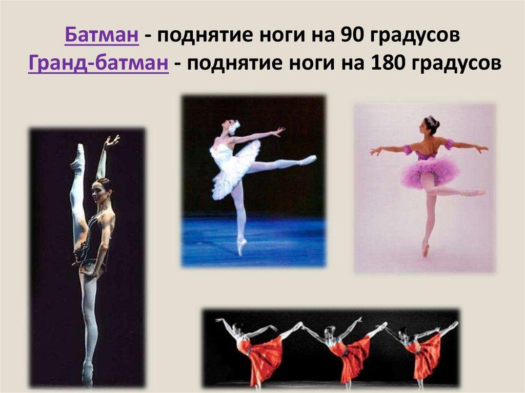 Батман - поднятие ноги на 90 градусовГранд-батман - поднятие ноги на 180 градусов