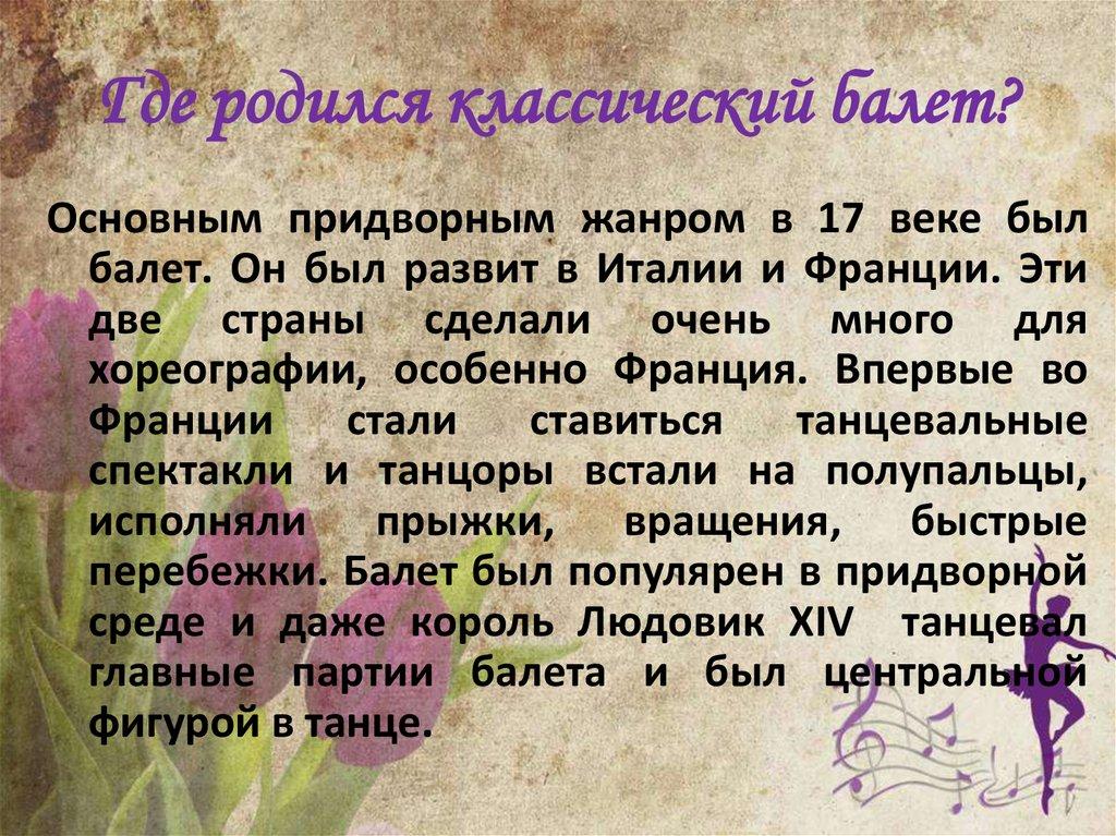 Где родился классический балет?Основным придворным жанром в 17 веке был