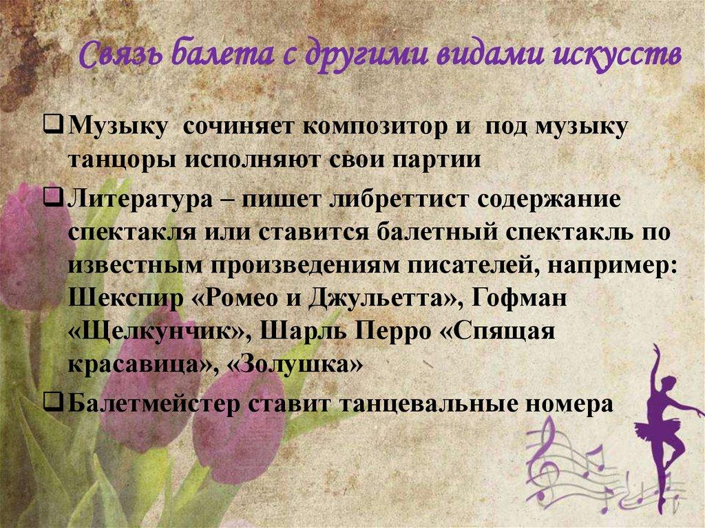 Связь балета с другими видами искусствМузыку сочиняет композитор и под музыку