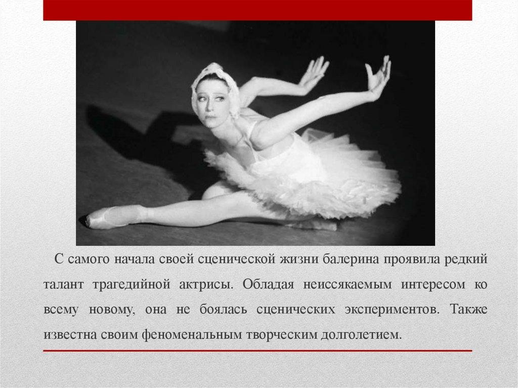 С самого начала своей сценической жизни балерина проявила редкийталант трагедийной актрисы. Обладая неиссякаемым интересом ко