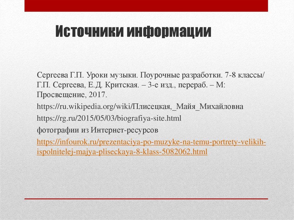 Источники информацииСергеева Г.П. Уроки музыки. Поурочные разработки. 7-8 классы/