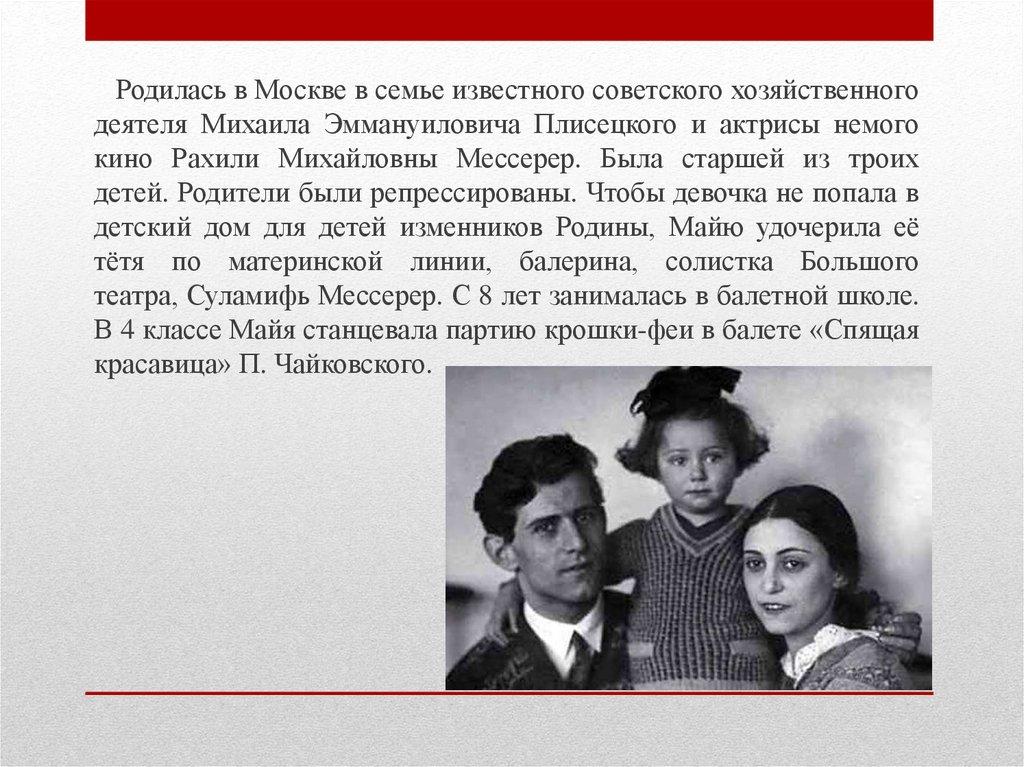 Родилась в Москве в семье известного советского хозяйственногодеятеля Михаила Эммануиловича Плисецкого и актрисы немого