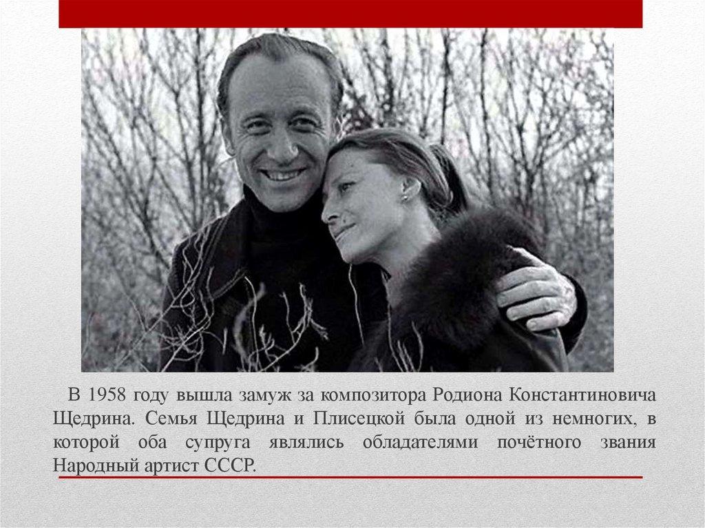 В 1958 году вышла замуж за композитора Родиона КонстантиновичаЩедрина. Семья Щедрина и Плисецкой была одной из немногих, в