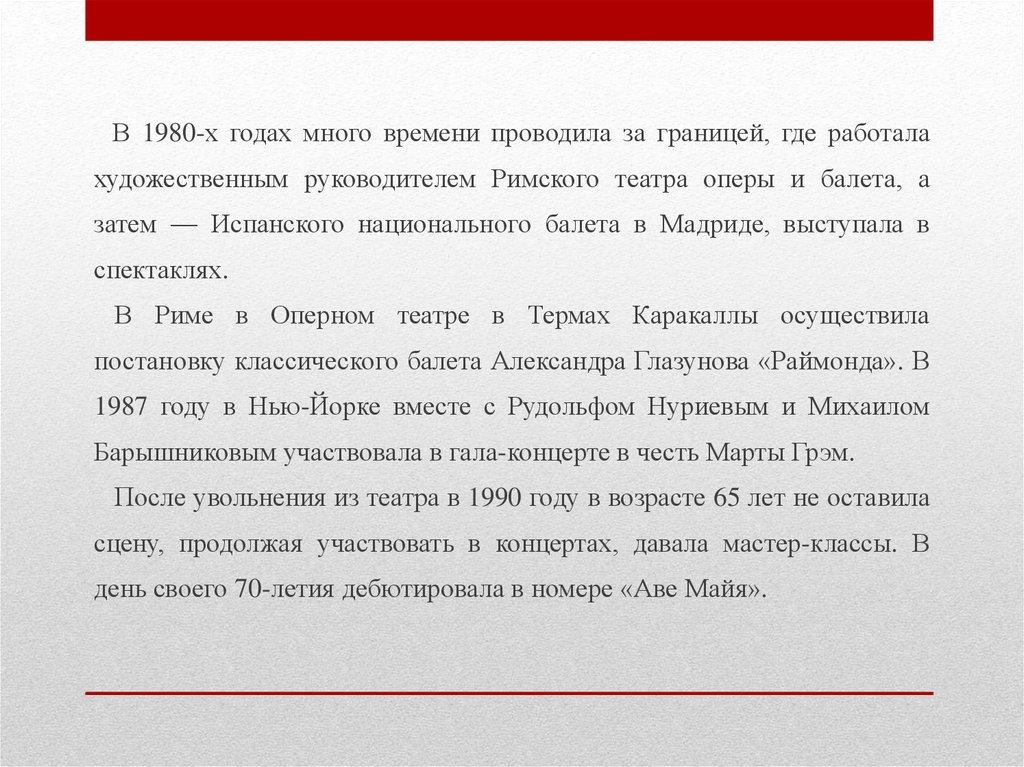 В 1980-х годах много времени проводила за границей, где работалахудожественным руководителем Римского театра оперы и балета, а