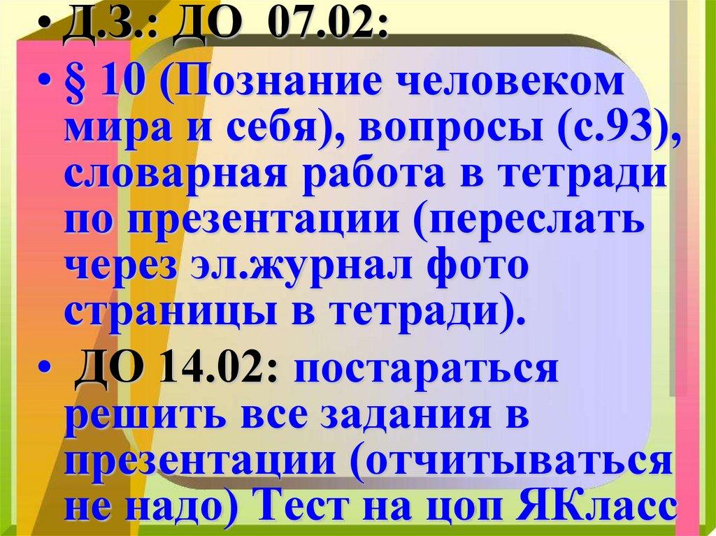 • Д.З.: ДО 07.02:• § 10 (Познание человеком