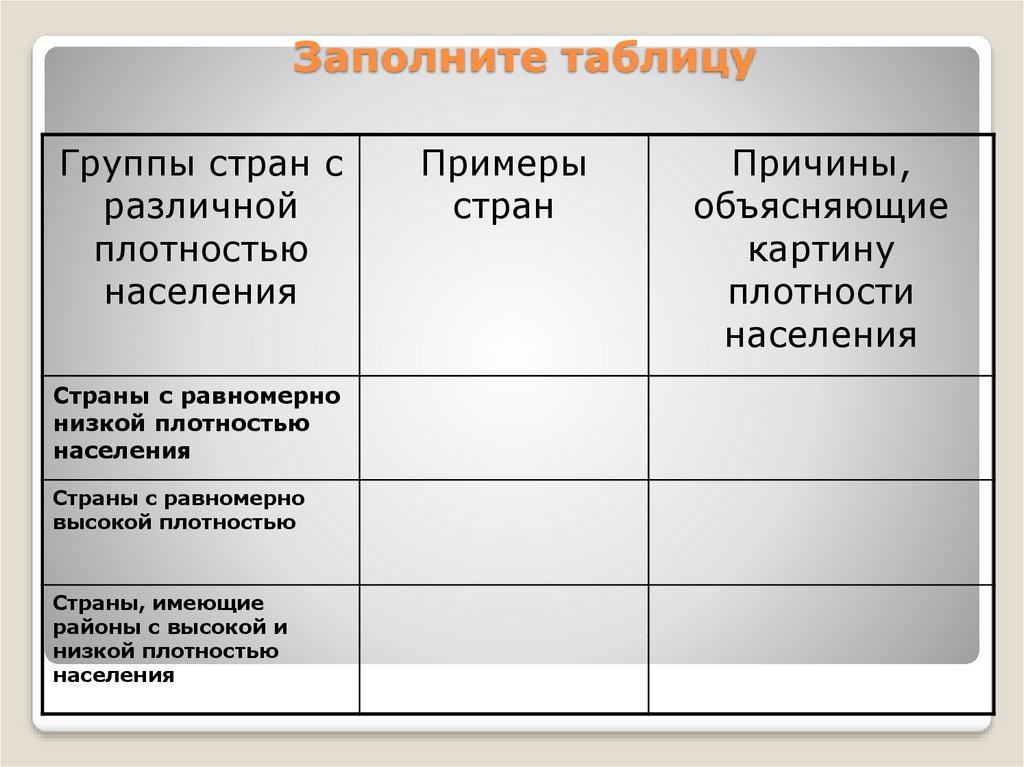 Заполните таблицуГруппы стран с