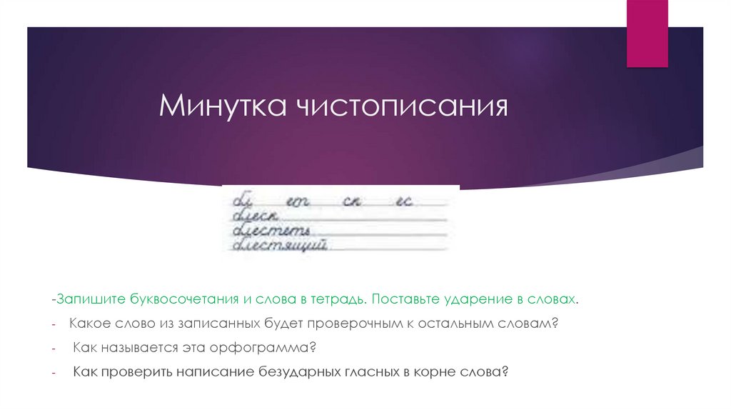 Минутка чистописания-Запишите буквосочетания и слова в тетрадь. Поставьте ударение в словах.