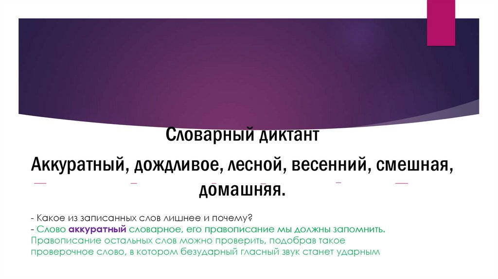 Словарный диктантАккуратный, дождливое, лесной, весенний, смешная,