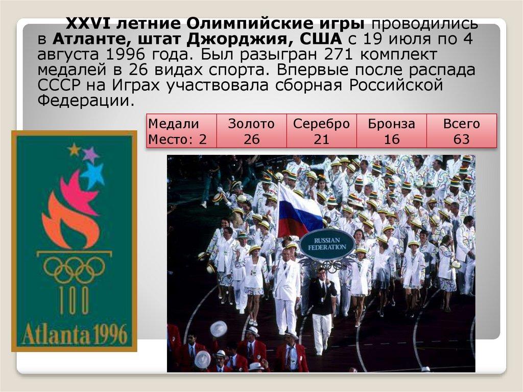 XXVI летние Олимпийские игры проводилисьв Атланте, штат Джорджия, США с 19 июля по 4