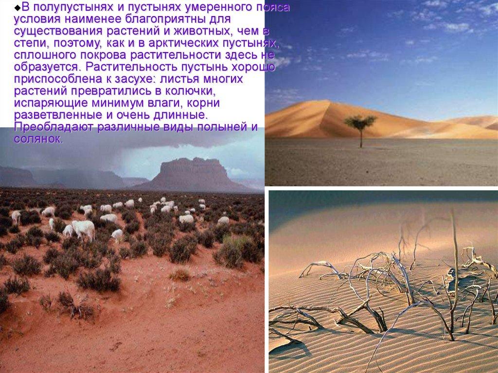 В полупустынях и пустынях умеренного поясаусловия наименее благоприятны для