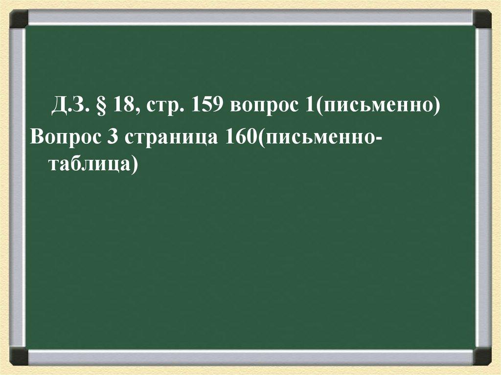 Д.З. § 18, стр. 159 вопрос 1(письменно)Вопрос 3 страница 160(письменнотаблица)