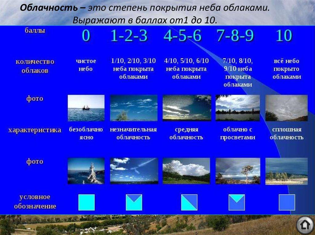 Облачность – это степень покрытия неба облаками.Выражают в баллах от1 до 10.
