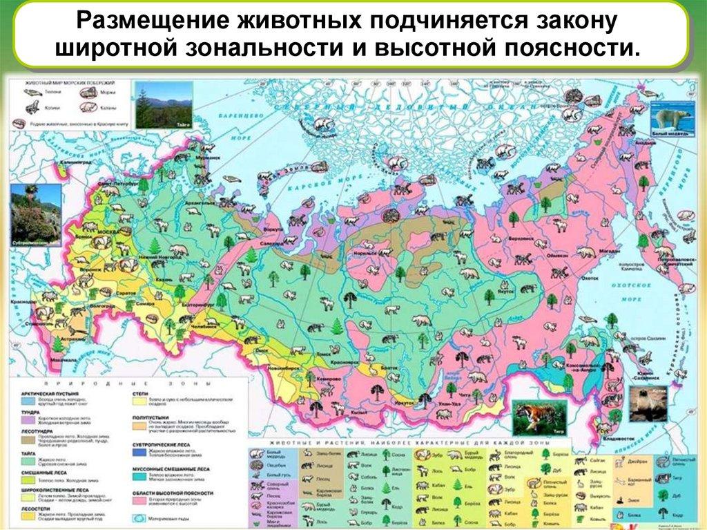 Размещение животных подчиняется законуширотной зональности и высотной поясности.
