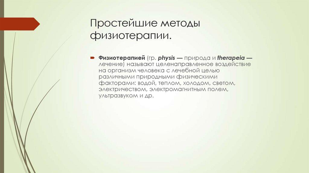Физиотерапией (гр. physis — природа и therapeia —лечение) называют целенаправленное воздействие