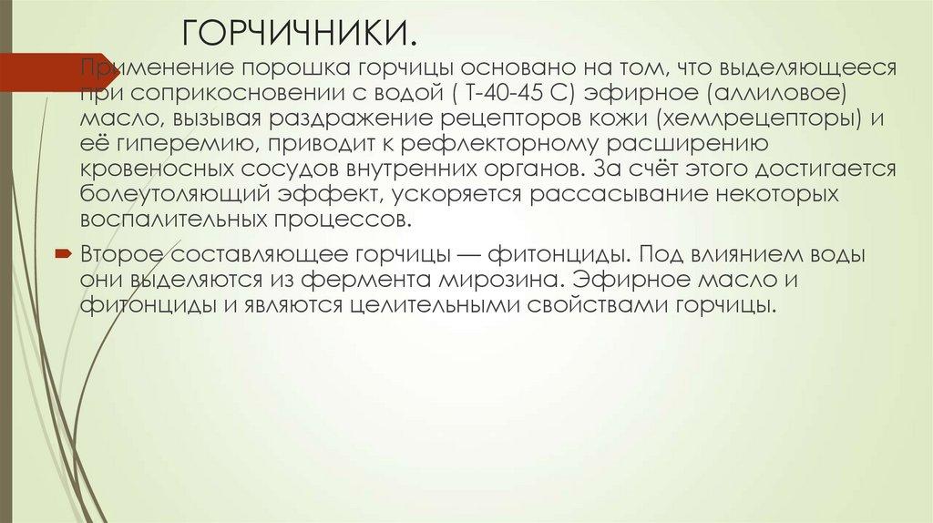 Применение порошка горчицы основано на том, что выделяющеесяпри соприкосновении с водой ( Т-40-45 С) эфирное (аллиловое)