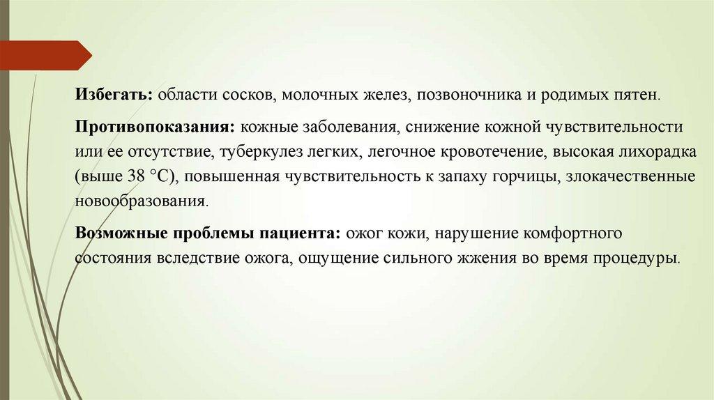 Избегать: области сосков, молочных желез, позвоночника и родимых пятен.Противопоказания: кожные заболевания, снижение кожной чувствительности