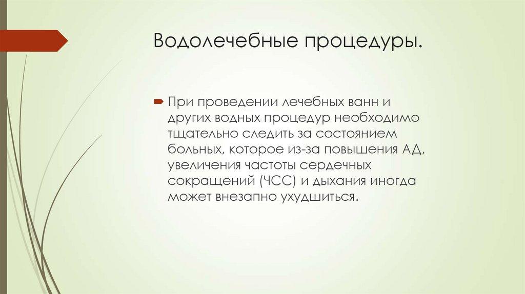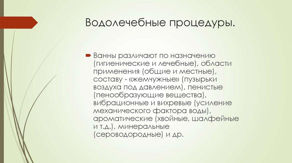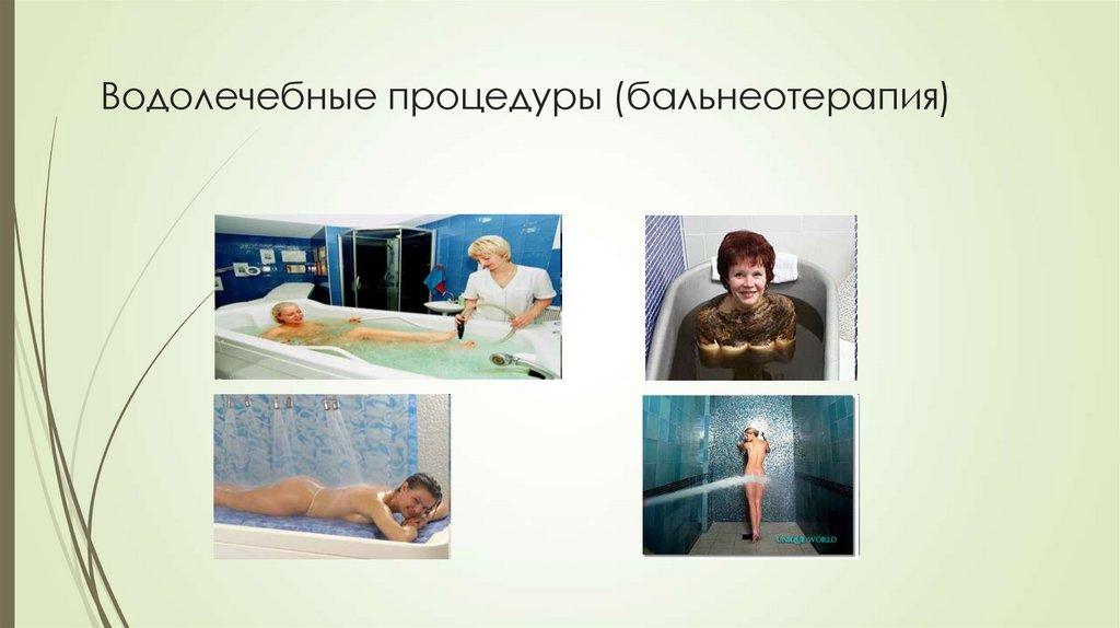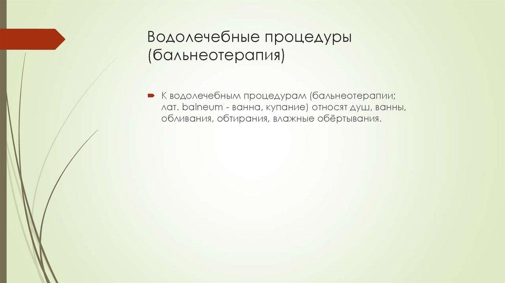 К водолечебным процедурам (бальнеотерапии;лат. balneum - ванна, купание) относят душ, ванны,