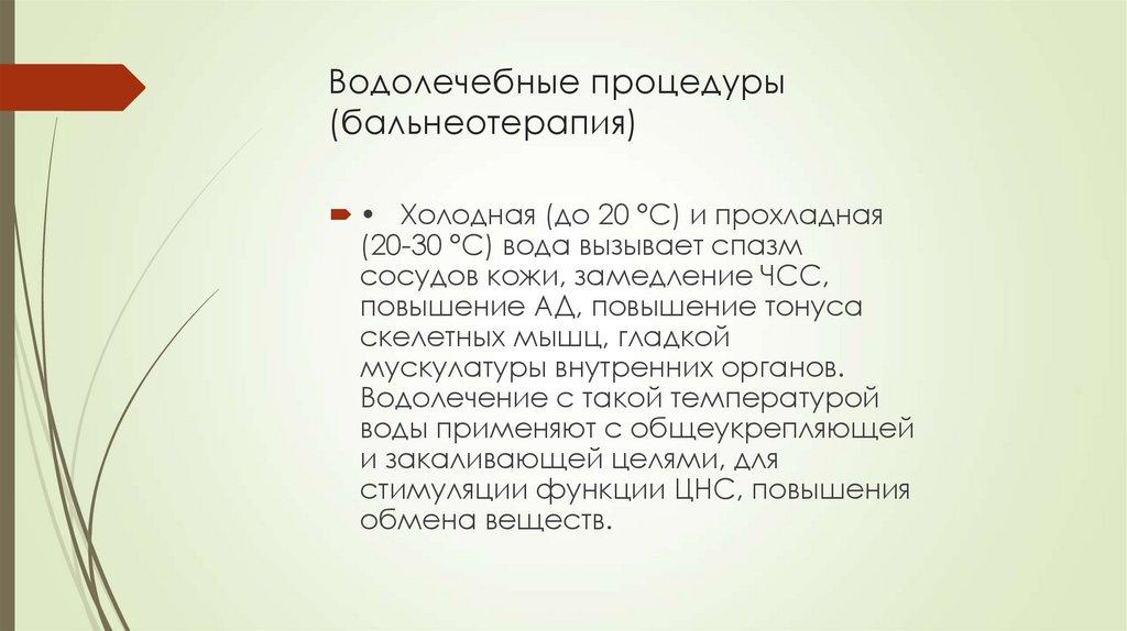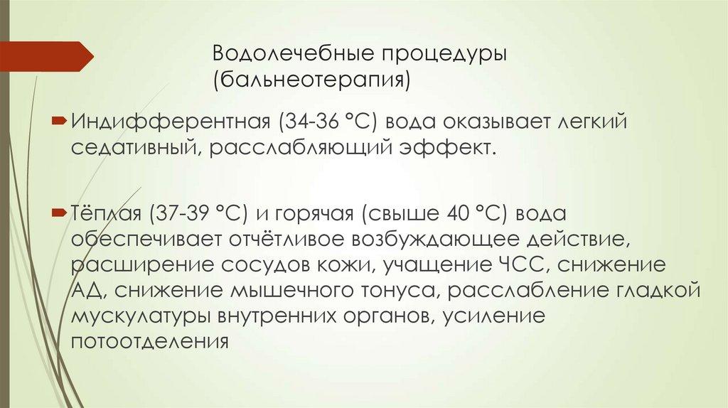 Индифферентная (34-36 °С) вода оказывает легкийседативный, расслабляющий эффект.