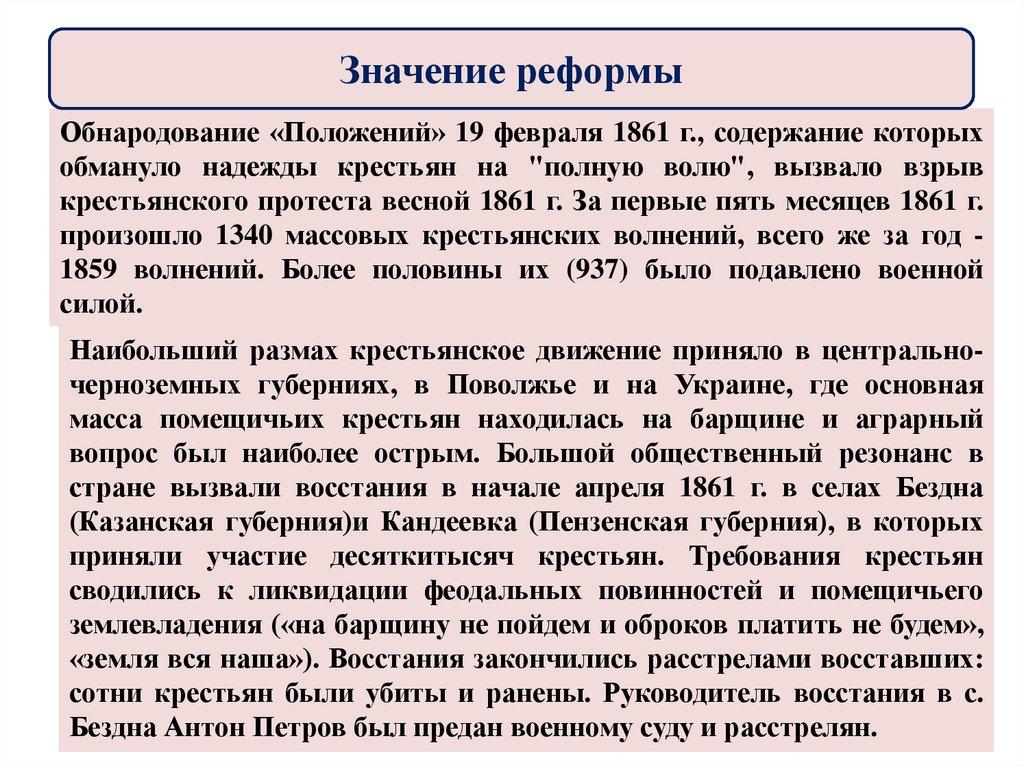 Значение реформыОбнародование «Положений» 19 февраля 1861 г., содержание которых