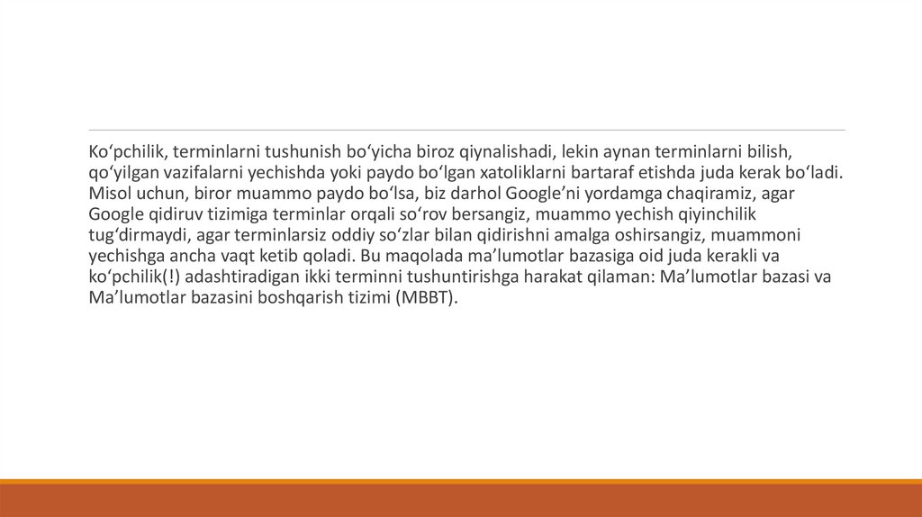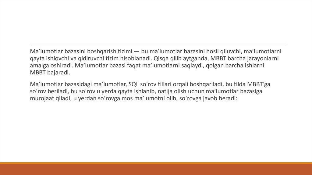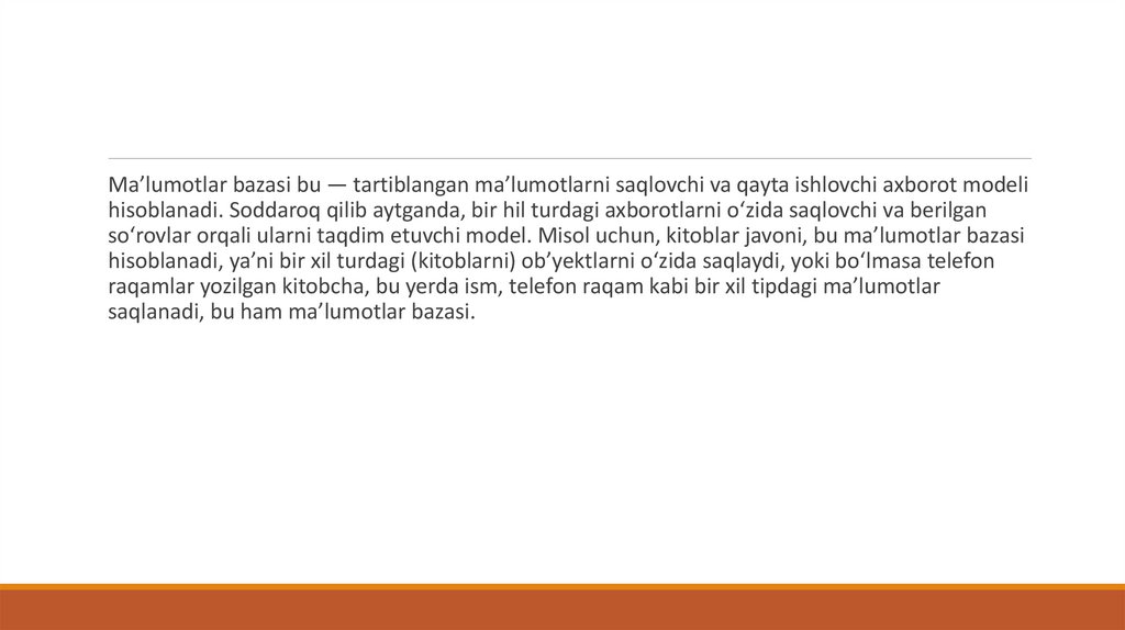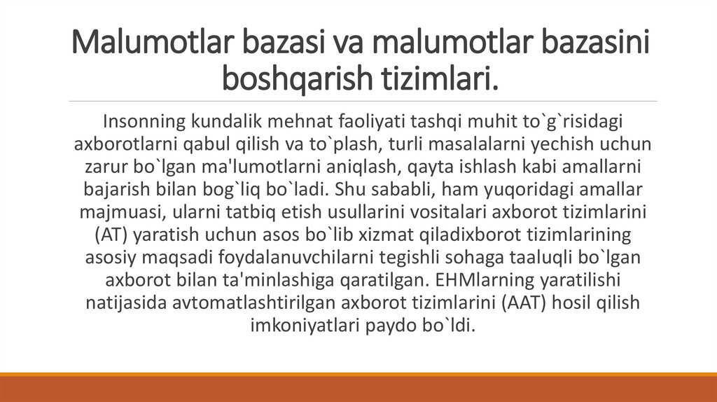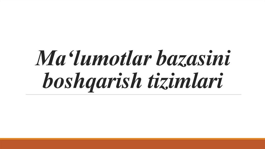 Malumotlar bazasi va malumotlar bazasiniboshqarish tizimlari.