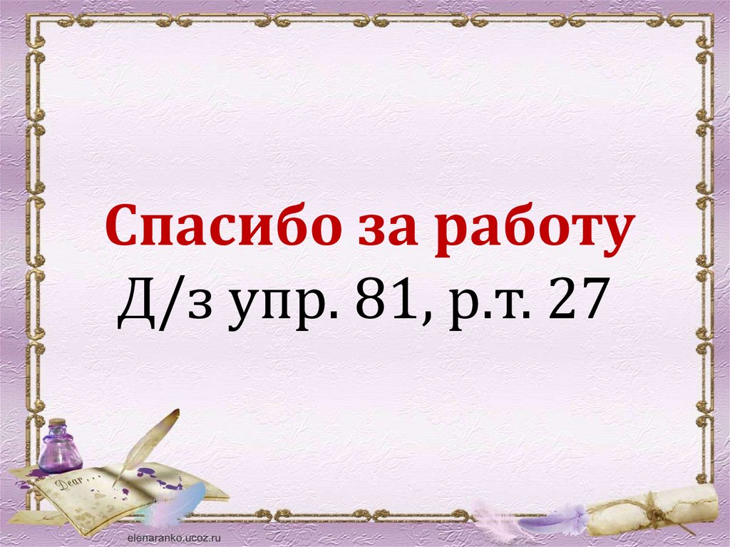 Спасибо за работуД/з упр. 81, р.т. 27