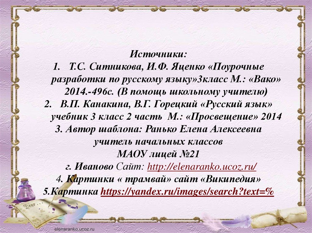 Источники:1. Т.С. Ситникова, И.Ф. Яценко «Поурочные