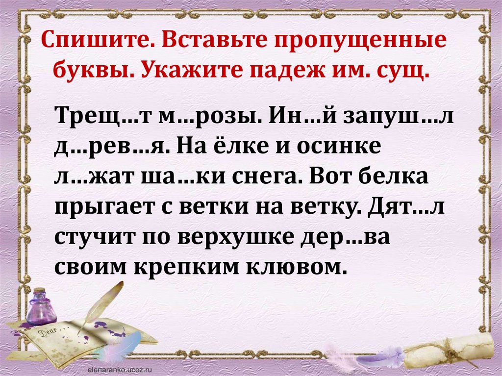 Спишите. Вставьте пропущенныебуквы. Укажите падеж им. сущ.