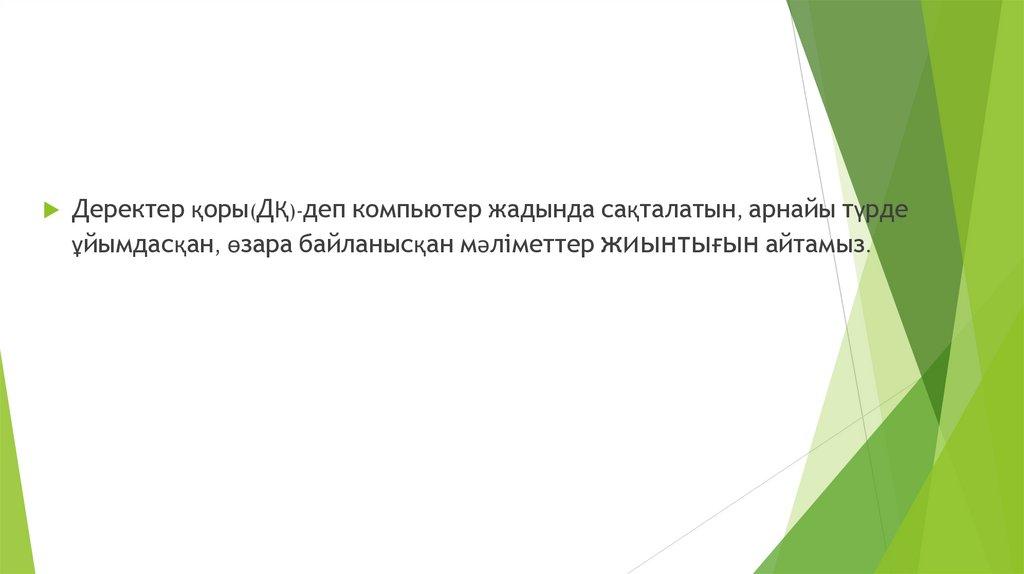 Деректер қоры(ДҚ)-деп компьютер жадында сақталатын, арнайы түрдеұйымдасқан, өзара байланысқан мәліметтер жиынтығын айтамыз.